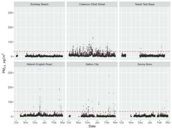 Hourly PM2.5 data for the government-operated monitors were obtained from the CARB for the study period from 1 October 2016 to 28 February 2017 [11]. During this period, six sites monitored PM2.5 (Figure 1). Some of the sites collected measurements using the beta attenuation monitor (BAM) instrument, while others used the tapered element oscillating microbalance (TEOM) instrument, but all reported data to the CARB, and only the data observations that met CARB Quality Assurance and Quality Control (QA/QC) [12] (145 observations were marked as “suspect” in CARB’s QA/QC, and were not included in the analysis) were included in the analysis (1405D TEOM Thermo Fisher Scientific, Franklin, MA operated at Bombay Beach, Naval Test Base, Salton City, and Sonny Bono sites; 1020 BAM Met One, Grants Pass, OR, operated at Calexico–Ethel Street and Niland–English Road sites). Five of the six sites were located around the Salton Sea. The remaining government-operated sites were located in Calexico, the Southern-most city in the valley on the US side of the border, adjacent to Mexicali. No hourly government PM2.5 monitoring existed in the towns between Calexico and Niland, which include the cities of El Centro (population 42,596), Imperial (14,752), and Brawley (24,953). However, daily PM2.5 data were available for Calexico–Ethel, Brawley, and El Centro-9th sites. Currently, 1-h ambient air quality standards do not exist for the NAAQS or for the California Ambient Air Quality Standards. For our analysis, we defined any hour at or above a concentration of 35 μg m−3 as an “elevated air pollution hour”. This concentration level corresponds to the 24-h NAAQS. Furthermore, we defined an “air pollution episode” as a period of one or more consecutive hour made up of elevated air pollution hours. For example, measurements at a site for two consecutive hours (e.g., 09:00 and 10:00) with concentrations of 50 and 51 μg m−3 would be considered to be two elevated air pollution hours, contributing to a single air pollution episode. Finally, because our definition of an episode allowed it to last a variable number of hours, and episodes could have overlapped and be double counted across both government and community monitoring sites, we defined a separate metric, an “episode day”, as a day in which any of the hours were equal to our greater than 35 μg m−3. This allowed us to compare the number of days during the study period that were similarly and dissimilarly identified as an episode day. Ozone and NO2 were also monitored in the valley. During the study period, the mean hourly O3 concentration at the Calexico–Ethel site was 0.026 ppm, and none of the sites reported concentrations above the 1-h California ozone standard (0.090 ppm). The average NO2 concentration during the study period was 0.014 ppm at the Calexico–Ethel site, and none of the sites reported concentrations above the 1-h California NO2 standard (0.180 ppm).