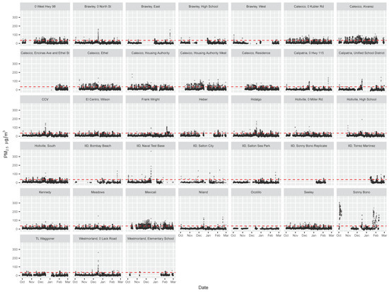 The highest average concentrations observed by the community monitoring network were considerably higher than those observed by the government monitoring network. Notably, a high average concentration of over 20 μg m−3 was observed at the Mexicali community site, which is located on the Mexican side of the border. Additionally, the Calexico Alvarez community site, which is close to the border crossing, measured a higher average concentration than the Calexico–Ethel community site, which is farther away from the border (18.56 vs. 13.51 μg m−3, respectively), even though both are situated within the same town of Calexico. In the Northern part of the valley, the highest average concentration, 27.18 μg m−3, was observed at the Sonny Bono site, which is close to the Salton Sea. This concentration was considerably higher than the concentration measured by government instruments at the Sonny Bono site—however, both the government data as well as the community monitoring data were fairly incomplete, and the collected data do not perfectly align with each other in time.