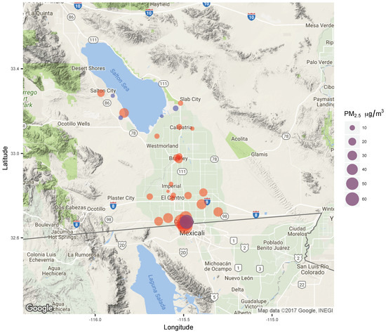 As part of a community-engaged research study aimed at addressing the high levels of PM2.5 air pollution (airborne particles with sizes less than 2.5 μm in diameter) and high rates of asthma hospitalizations in the Imperial Valley, California, PM air quality monitors were deployed over a two-year period from 2015–2016. By spring 2017, 38 community air monitors were installed at permanent locations, supplementing the existing network of six government PM2.5 monitoring sites in the area. The overarching aim of this study and the community-engagement process is to fill the need for more spatially and temporally refined and real-time data on PM levels in the Imperial Valley, a region that often exceeds air quality standards [1,2].
