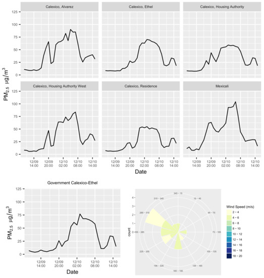 Time-series of concentrations observed during the 10 December 2016 episode at different sites (the government-operated Calexico–Ethel site is on the bottom left). The wind rose during the episode (bottom right).