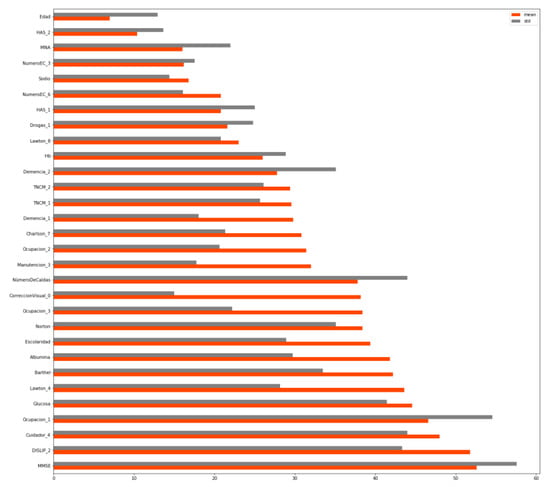 The order of importance is determined by the mean of its different rankings, which is shown in orange. Thus, age proved to be the most influential variable, while Mini-mental state examination (MMSE) proved to be the 13th most influential one. The categorical variables are followed by a number, which represents the importance of that category within that variable. For instance, the second most influential variable for predicting the sarcopenia level in older adults would be the one that has a HAS level 2.