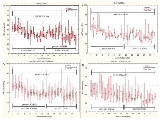 Median aspartate aminotransferase activities (AST) in: (A) The midfielder, (B) defender, (C) midfielder/defender and (D) goalie/substitute subgroups over the course of the soccer match season.