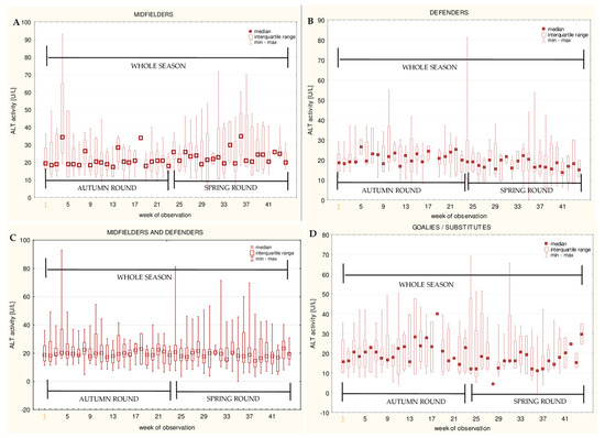 Median alanine aminotransferase (ALT) activities in: (A) The midfielder, (B) defender, (C) midfielder/defender and (D) goalie/substitute subgroups over the course of the soccer match season.