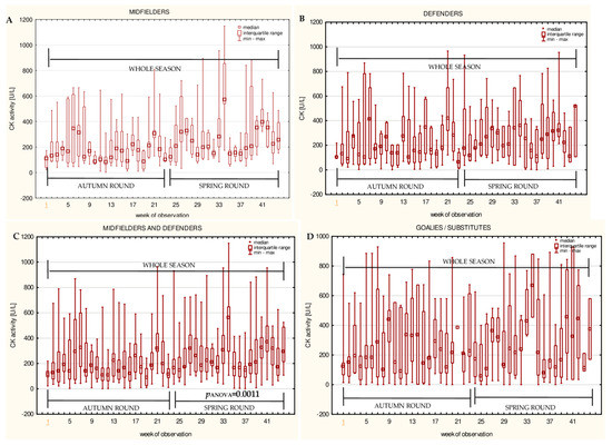 In the current study, none of the subgroups significantly differed in the creatine kinase activity levels. This is likely due to the large interindividual variability in the CK activities. Nonetheless, it was noticed that the CK activity varied significantly with time in the midfielder/defender group (particularly in midfielders) during the spring round of the soccer season. It can also be seen that a weak positive significant correlation between the CK level and the cumulative match-time was present in this group. The most active players, like midfielders, perform immense physical effort during each soccer match, so it is therefore not surprising that an increasing trend in the CK level was observed in this subgroup. These results are consistent with the work of other researchers, where the creatine kinase level was also found to have increased [6,31,34,42,43,44]. In fact, the soccer players are expected to have permanently elevated CK values, because they are exposed to training or match effort every day [3,45]. Moreover, the study of Souglis et al. confirmed the different responses over time between playing positions, where significantly, the highest peaks in the CK levels were observed in the midfielders compared with the defenders [46]. One of the reasons for changing the CK activity during the annual observation might be seasonal fluctuations. The recently published rhythmometric analyses of psychophysical markers in soccer players did not reveal the presence of a significant circannual rhythm in the CK activity [39]. Therefore, this factor is excluded as a cause of the CK activity increase. However, considering that a large interindividual variability of this muscular origin enzyme exists, CK seems to be an unsuitable parameter for monitoring the recovery process.