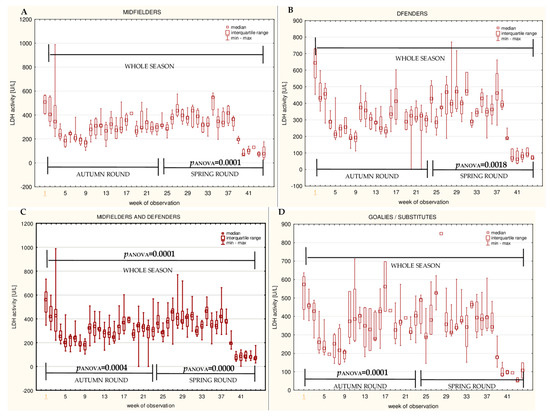 Median lactate dehydrogenase (LDH) activities in: (A) The midfielder, (B) defender, (C) midfielder/defender and (D) goalie/substitute subgroups over the course of the soccer match season.