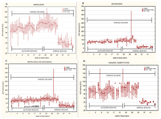 Median alkaline phosphatase(ALP) activities in: (A) The midfielder, (B) defender, (C) midfielder/defender and (D) goalie/substitutesubgroups over the course of the soccer match season.