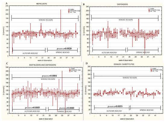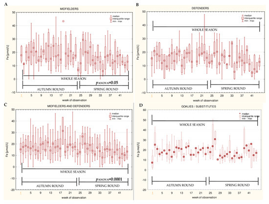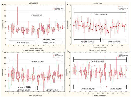 The data for the longitudinal observation of the median levels of the selected blood biomarkers during the soccer match season, assessed using Friedman’s repeated measures analysis of variance on the midfielder, defender, midfielder/defender and goalie/substitute groups, are presented in Figure 1, Figure 2, Figure 3, Figure 4, Figure 5, Figure 6, Figure 7, Figure 8 and Figure 9. In the midfielder/defender group, the lactate dehydrogenase activity decreased (Figure 4C), the creatinine level varied (Figure 6C), and the magnesium level decreased (Figure 8C) significantly with time, regardless of the phase of the competition. In turn, the creatine kinase activity increased (Figure 3C), the urea level increased (Figure 7C), and the iron level increased (Figure 9C) significantly with time only in the spring round. On the other hand, the aspartate aminotransferase activity significantly decreased (Figure 1C) in the midfielder/defender group only in the autumn round. In the goalie/substitute group, the LDH activity significantly decreased (Figure 4D), and the Cr level increased (Figure 6D) only in the autumn round.