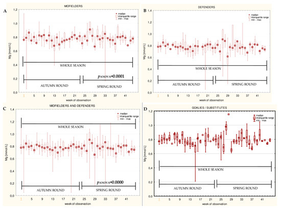 Median magnesium (Mg) levels in: (A) The midfielder, (B) defender, (C) midfielder/defender and (D) goalie/substitute subgroups over the course of the soccer match season.