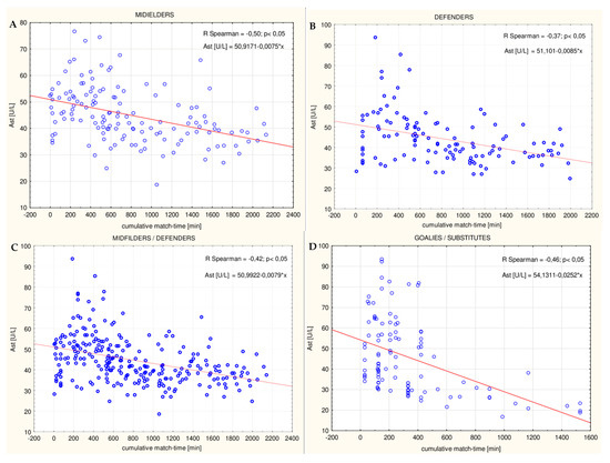 When the midfielders and defenders were analyzed as individual subgroups, a significant negative correlation between the activities of AST and the cumulative game time was observed in both subgroups (R = −0.50 (Figure 10A); p ≤ 0.05, and R = −0.32; p ≤ 0.05 in the midfielders during the autumn and spring round, respectively, and R = −0.37; p ≤ 0.05 (Figure 10B), and R = −0.33; p ≤ 0.05 in the defenders during the autumn and spring round, respectively). The ALT was slightly negatively correlated with time only in the midfielders (R = −0.25; p ≤ 0.05 in the autumn round). In both subgroups, the activity of creatine kinase significantly increased with time during the entire season (R = 0.30; p ≤ 0.05, and R = 0.23; p ≤ 0.05 in the midfielders and defenders, respectively). In turn, the activity of alkaline phosphatase increased with time in the autumn round and decreased in the spring round (R = 0.18; p ≤ 0.05, and R = −0.39; p ≤ 0.05 in the midfielders during the autumn and spring round, respectively, and R = 0.29; p ≤ 0.05, and R = −0.35; p ≤ 0.05 in the defenders during the autumn and spring round, respectively). Additionally, in players from both positions, a negative correlation between the game time and the magnesium level was noted (R = −0.19; p ≤ 0.05, and R = −0.30; p ≤ 0.05 in the midfielders during the autumn and spring round, respectively, and R = −0.32; p ≤ 0.05 in the defenders only during the spring round). On the other hand, only in the midfielders was a decrease in the iron level (R = −0.33; p ≤ 0.05 in the entire season) and the LDH activity (R = −0.33; p ≤ 0.05 in the spring round) with time observed. The creatinine level increased significantly with time, especially in the autumn round in this group (R = 0.41; p ≤ 0.05, and R = 0.17; p ≤ 0.05 in the autumn round and entire season, respectively). In turn, in the defender subgroup, the LDH activity decreased with time in the spring round but increased in the total season (R = −0.29; p ≤ 0.05, and R = −0.23; p ≤ 0.05 in the midfielders during the spring round and entire season, respectively). Contrary to the midfielders, a negative correlation between the creatinine level and the cumulative game time (R = −0.28; p ≤ 0.05) and a positive correlation in the case of the iron level in the defender group (R = 0.23; p ≤ 0.05) were observed.