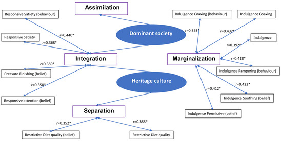 Table 6 indicates that the belief of laissez-faire attention and diet quality, pressuring with cereal and soothing, satiety responsiveness and indulgence pampering were not significantly correlated with integration, assimilation, separation and marginalisation (r < 0.350). The belief of pressuring finishing and responsive attention were weakly correlated with integration (r = 0.359, 0.358; p < 0.05). The belief of restrictive diet quality was weakly correlated with separation (r = 0.352, p < 0.05), and the belief of indulgence permissive, coaxing and soothing were moderately correlated with marginalisation (r = 0.412, 0.421, 0.439 and 0.422, respectively; p < 0.05).