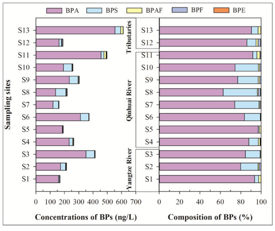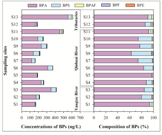 In terms of monomer composition, the compositions of BPs in the soluble phase at each sampling site are generally similar. The dominant BP was BPA with a mean composition of 83.4%, followed by BPS (13.5%), BPAF (1.8%), and BPF (1.0%) (Figure 2). In a river-lake system of the Taihu Lake basin [11], the mean contribution rates of BPA, BPS, and BPF were 81.8%, 12.5%, and 4.7%, respectively, which were similar to our results. The pollution levels of BPA in sampling sites S3, S6, S11, and S13 were above 300 ng/L, while BPS in S3, S6, S8, S9, S10, and S13 were higher than 40 ng/L, which were similar with the Taihu Lake basin [11]. Among the alternatives to BPA, BPS was the most abundant alternative to BPA in the Nanjing section of the Yangtze River and Taihu Lake basin [21], which were clearly different from the Pearl River Delta, where BPF has 78.8% of a contribution rate as the main BP. These results suggest that BPS is being widely used in the Yangtze River basin.