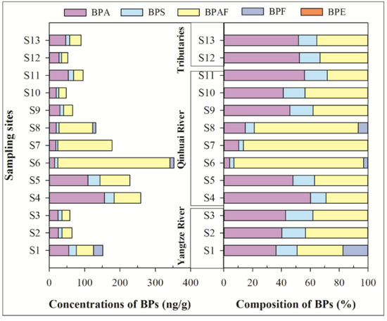 Figure 4 presents the concentrations’ composition of BPs in the SPM samples. In the SPM, four of the six BPs were detected, and detection frequencies were 23.1–100%. Neither BPZ nor BPE was detected in all of the sampling sites. The mean concentrations of ΣBPs were from 47.5 ng/g to 353 ng/g. Among them, BPAF was the predominant BP, with a mean concentration of 46.7 ng/g, which is followed by BPA (38.8 ng/g), BPS (12.4 ng/g), and BPF (2.10 ng/g). In SPM samples of the Taihu Lake basin, the concentrations of BPA were from no detection (ND) to 877 ng/g dw (mean: 76.8 ng/g dw) [25], which were comparable to that of our study and the Yangtze River (Nanjing section). It ranged from ND to 364 µg/g (mean concentration 51.8 µg/g) [18]. However, only a few research studies were the focus on the other BPs’ residues in SPM.
