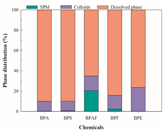 In order to assess the potential importance of particulate matter to environmental behavior of BPs in the aquatic environment, Figure 5 calculated the proportions of adsorption contribution of SPM and colloids to BPs. On average, 90.0% of BPA, 89.9% of BPS, 65.3% of BPAF, 84.2% of BPF, and 76.5% of BPE were found in the soluble phase. These findings were similar to those reported in the Pearl River [26], where between 24.4% and 94.1% of BPA was detected in the soluble phase. These results sugget that the majority of BPs exist in a dissolved state in surface water. In the colloidal phase, 9.7% of BPA, 9.6% of BPS, 14.4% of BPAF, 13.5% of BPF, and 23.5% of BPE were associated with colloids, which were covered in the results reported by Gong et al. [26], where colloid-bound BPs ranged from 3.6% to 52.4% for BPA, and 16.7% to 63.1% for 4-nonylphenol (logKow = 4.48). Si et al. found that 9.5% of BPS, 10.9% of BPA, 25.2% of BPF, and 50.4% of BPAF were bound with colloids in surface water from the Taihu Lake basin (Wujin district) without taking SPM into account [11]. In the present study, 0.2% of BPA, 0.5% of BPS, 2.3% of BPF, and 20.3% of BPAF were bound with SPM, which were much lower than that of colloids with the exception of BPAF. The findings indicate that colloids were potential sinks for BPs, which might influence the environmental behaviors of BPs due to its ubiquity, abundance, and mobility in aquatic systems.