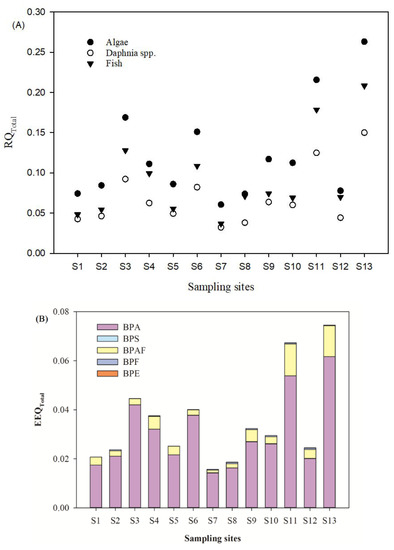 The increased emission and widespread presence of BPs in water bodies may have adverse effects on the ecosystem [28]. Screening level risk assessments of BPs were carried out based on the BPs’ concentrations in the traditionally soluble phase. The toxicity data of BPs were presented in Table S5 for the most sensitive aquatic organisms. Based on the evaluation criteria of risk levels (Low risk: 0.01 ≤ RQ < 0.1, medium risk: 0.1 ≤ RQ < 1, high risk: 1 ≤ RQ), the RQ values for detected BPs (except BPA) were mostly below 0.01, which suggests that low risk exists in the related aquatic organisms. The RQ values of BPA in most sampling sites exceeded 0.1 for algae, which indicates that medium risk for the growth status of Selenastrum capricornutum might exist [29]. Due to co-existence of BPs and their similar action patterns, the total risk quotient (RQTotal) of the detected BPs was evaluated to describe the worst-case scenario (Figure 6A). The RQTotal of algae were from 0.067 to 0.274, daphnia spp. from 0.036 to 0.156, and fish from 0.041 to 0.236, respectively. In this study, fish was the most sensitive species, which was followed by daphnia spp. and algae. In general, the mixture risk contribution rate of each BP decreased in following order: BPA (87.4%) > BPE (5.9%) > BPAF (3.8%) > BPS (2.0%) > BPF (0.9%).