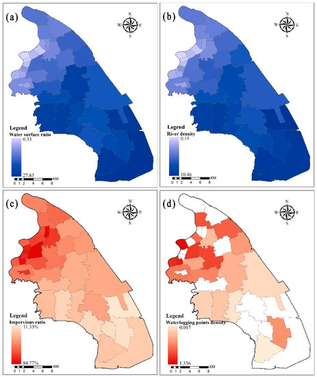 Figure 4. Characteristics of the Pudong New Area. (a) Water surface ratio of the Pudong New Area; (b) River density of the Pudong New Area; (c) Impervious ratio of the Pudong New Area; (d) Waterlogging points density of the Pudong New Area.