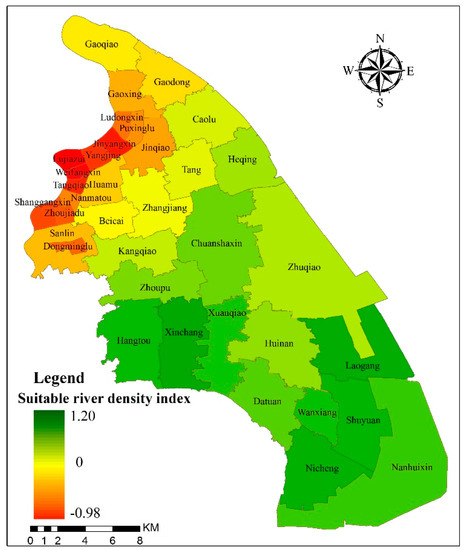 The current river density of the PNA is 4.6 km/km2, which does not reach the threshold of 5.1 km/km2 of suitable river density (Table 2). There are 19 districts meeting the requirements of suitable river density, accounting for 52.8%, and 17 districts that did not meet the suitable river density (Figure 6). The distribution of the suitable river density is basically the same as that of the suitable water surface ratio. Only the Zhangjiang district can reach the suitable water surface ratio but not the suitable river density. The distribution of the Ird in each district is similar to that of the Iwsr. From northwest to southeast, the Ird increases gradually. The four districts with the worst suitable river density index are Lujiazui, Weifangxin, Jinyangxin and Tangqiao; their suitable river density is 6, 5.9, 6 and 5.9 based on the calculation, while the actual river density is 0.1, 0.6, 0.7 and 0.7, respectively.