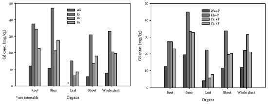 Cadmium (Cd) contamination of soil is a global problem associated with activities such as mining, leather treating, electroplating, and fertilization [1]. Plants have many mechanisms to alleviate stress due to Cd. Different plant organs use its chemical forms—including inorganic Cd (FE), water-soluble Cd (FW), pectate- and protein-integrated Cd (FNaCl), undissolved Cd phosphate (FHAc), Cd oxalate (FHCl), and residual Cd (FR)—in detoxification mechanisms [2,3]. In particular, the mobility of FE and FW is higher than that of other chemical forms; thus, it is easy to translocate them upward from roots to shoots [4,5,6]. The compartmentalization of Cd into chemical forms depends on the plant species under consideration [7,8], but many plants compartmentalize it into FNaCl as a detoxification mechanism [5,7,9].