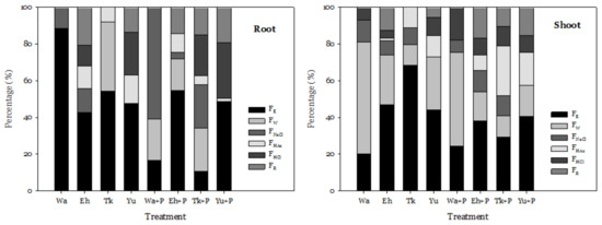 Regardless of the treatments, the accumulated Cd was mainly compartmentalized into FE and FW (Figure 4). These two chemical forms have high mobility and are thus easy to translocate to other organs [4,24]. The percentage of Cd as FE in shoots decreased by 6–40%, while the percentages of other chemical forms increased after the addition of P. This decreased the mobility of Cd and alleviated the toxicity of Cd [5]. P treatment also increased the percentage of FNaCl in the shoots of water spinach grown in Tk and Eh. Relative to the controls, the percentage of Cd as FHAc in the shoots of water spinach grown in the Tk + P, Eh + P, and Yu + P treatments increased 7–16%. In line with Yin et al. [23], for the four soil series treated with P, the sum of FHAc, FHCl, and FR increased 11–37% compared to the controls. Also, similar to Du et al. [25], the experimental results revealed that P addition stabilized the accumulated Cd in the shoots, decreasing its negative effects on water spinach. This is why P addition promoted the growth of water spinach in the four soil series.
