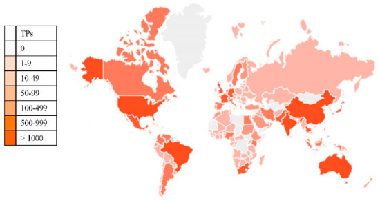 Global distribution of publications related to sugarcane research. TPs: Total Publications. Source: SCOPUS (27 August 2019).