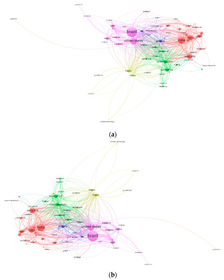 Science maps are used in order to visualize the relationship between related items. Distance-based maps are maps in which distance reflects relationships, i.e., smaller distance reflects a stronger relationship [14]. In Figure 3, we present a co-authorship country network using VOSviewer for total documents published and citations. A node represents a country and its size indicates its contribution to the research on sugarcane topics. The thickness of the lines reflects the tightness of cooperation between countries. Researchers from a total of 609 countries had publications. A rule of 25 documents per country was used in order to create the map, so a total of 74 countries were retained and 8 clusters were created. In Figure 3a, it can be seen that the countries with the largest number of documents were Brazil (8431), United States (4174), India (4137), Australia (2455), and China (2086). Figure 3b shows the countries with the highest number of citations: Brazil (115,078), United States (89,683), India (44,806), Australia (38,267), and China (25,915). The United States was the country with the most collaboration around the globe. Brazil had the highest level of collaboration with other Latin American countries such as Mexico, Cuba, and Colombia. China, Australia, and other Asian countries showed a strong collaboration network, and India showed collaboration with countries in Asia. France was linked to Morocco and other former French colonies, while other European countries collaborated mainly with African countries.
