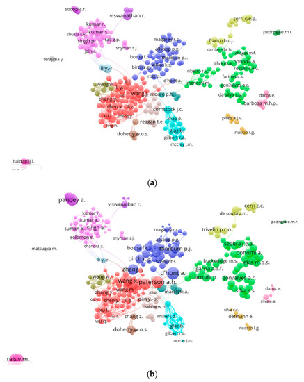 A second pair of maps was created for co-authorship using VOSviewer software. In Figure 4, a node represents an author, and the size represents productivity. We set the threshold at 25 documents and 10 citations per author. The VOSviewer software divided these 264 items into 18 clusters. One color represents one cluster. The author with the most documents was Viswanathan, who works with sugarcane diseases, particularly viruses (109 publications with a total of 963 citations in the sugarcane database used); the second author was Li Y.-R. (106 publications with a total of 619 citations), who publishes research on diverse topics (Figure 3a). The most-cited authors were D’Hont A. (49 documents and a total of 3059 citations in the sugarcane database used), Paterson, A. H. (31 documents and a total of 2736 citations), and Pandey, A. (42 documents and a total of 2619 citations); the research of the first two authors is principally in the area of sugarcane genomics while the last author studies biotechnology. In terms of the clusters, it is clear that the researchers tend to group by country, as collaborations are less limited by geographic distance and language issues; this allows one to observe highly productive researchers in different countries, e.g., Viswanathan in India, Bonomi, A. in Brazil, or Allsopp, P.G. in Australia. The largest cluster is made up of Chinese researchers, a second cluster comprises Brazilian researchers, the third cluster is constituted by Indian researchers, the fourth by Australian researchers, while the rest were clusters with twelve researchers or fewer who do not collaborate to a large extent with other researchers; these are the small independent dots in Figure 4.