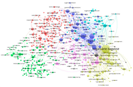 The map in Figure 5 used as a rule the co-occurrence of at least five times each term, including 500 terms organized into seven clusters. The terms sugar cane, sugarcane, and Saccharum were excluded. The first cluster in the first map included terms related to crop yield (red), the second terms related to genomics (green), the third terms related to sugarcane juice (pink), the fourth bioenergy (bio-ethanol, biofuel, biogas, biomass, etc.) (purple), the fifth included terms related to sugarcane bagasse (yellow), the sixth to decomposition of sugarcane bagasse (light blue), and the seventh to lignin (gray).