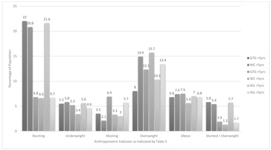 With the prevalence of stunting in children in GTG and the WC combined at 21.6%, overweight 10.3% and obesity 7% in the under-five age group, and 6.7%, 13.4% and 6.8% respectively in the 5 –<10-year olds, it is very unlikely that these provinces, and most probably the country as a whole, considering the information provided in Table 7, will be able to meet the United Nation’s Sustainable Development Goal (SDG) 2, target 2.2 of ending all forms of malnutrition by 2030 [27]. The prevalence of underweight (WAZ) of 5.6% and wasting (BAZ) of 3% in under-five year olds and 4.6% and 5.7% respectively in 5–<10-year olds in this study is approaching the 2030 goal of <3%, which is strictly interpreted as levels of malnutrition that could be expected in a healthy population distribution [27]. However, it must be noted that the prevalence of wasting among the eight-year-old boys was significantly higher than in girls (7.5% versus 0%), indicating that more vulnerable subgroups should be identified and specifically targeted for intervention.