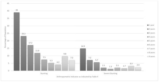 Prevalence of stunting and severe stunting in children aged 1–<10-years by year age groups.