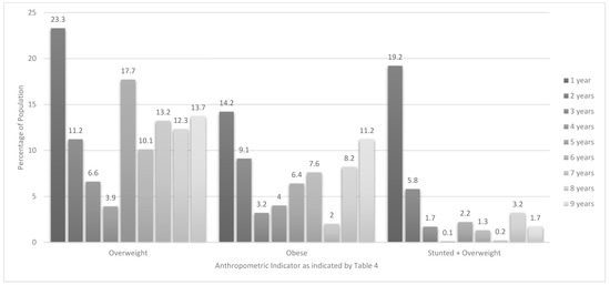 Results showed consistently that those under two years of age were the most vulnerable to experiencing stunting, overweight/obesity and stunting & overweight. Given how critical the first 1000 days is for future growth and development our results emphasize that this age group should remain a key target population for nutrition intervention. It should, however, be borne in mind that interventions and approaches should be sensitive to the different forms of malnutrition as intervention needs may differ. For example, Tzioumis et al. [31] caution that interventions that target only stunting, especially those that promote ‘catch-up’ growth, may unintentionally contribute to overweight/obesity risk.