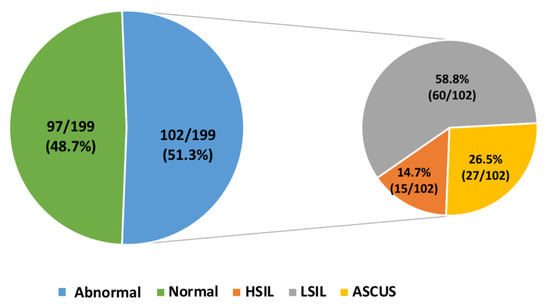 One hundred ninety-nine consecutive women with a recent history of abnormal cervical cytology were recruited. An abnormal Pap test at enrollment (“retesting” result) was detected in 51.3% (102/199) of women (median age 31 years, IQR: 26–42 years): 14.7% (15/102) showed a high-grade squamous intraepithelial lesion (HSIL), 58.8% (60/102) a low-grade squamous intraepithelial lesion (LSIL), and 26.5% (27/102) atypical squamous cells of undetermined significance (ASCUS). Normal cervical cytology was detected on “retesting” in 48.7% (97/199) of recruited women (median age 35 years, IQR: 27–44 years) with a previously documented abnormal Pap test in the preceding 2–6 months (Figure 1).
