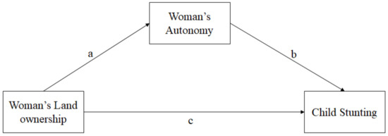 Structural equation modeling (SEM) is a coherent statistical technique used to analyze the mediation effect, with the ability to estimate various multiple regressions or equations altogether. It provides a more effective and direct way to calculate the coefficients of direct and indirect paths and their significance. In this study, we used mediation analysis in the SEM framework to gain information on the underlying mechanism by which women’s land ownership affects child growth stunting. The details on rudimentary channels help project designers and policy thinkers to improve interventions and make cogent policies. Following Cheong and Mackinnon [42], the structural link between the dependent variable, the mediator and the independent variable takes the mathematic form of: