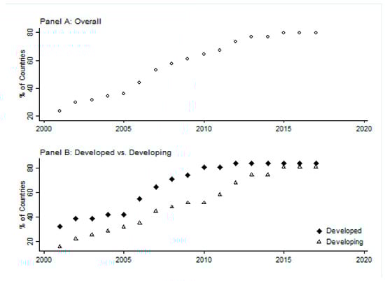 As noted, there has been a move towards uniformity in tobacco advertising policies across the world: by 2017, most countries have adopted the majority of advertising restrictions regarded by WHO FCTC as best practices. Figure 1 presents a picture of the extent of this uniformity. A policy is classed as comprehensive if five or more media are banned [2]. Panel A plots the percent of countries in the sample that have adopted comprehensive advertising restrictions from 2001 to 2017. Panel B plots developed and developing countries separately. Overall, the basic trend is toward further tobacco control. The total number of countries having a comprehensive set of advertising restrictions increased from 15 in 2001 (23%) to 51 in 2017 (80%). The number is significantly higher in 2017 in both groups, suggesting that advertising control policies have become more restrictive over time.