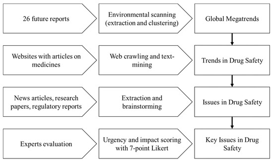 Global megatrends, trends in drug safety, and key issues in drug safety were identified using a method referring to foresight methodologies used by Ministry of Science, Information and Communication Technology (ICT) and Future Planning, and Korea Institute of Science and Technology Evaluation and Planning (MSIP and KISTEP; Figure 1) [13]. We modified the method to suit the scope of drug safety. The scope of the drug safety considers the whole life cycle of drugs, which runs from premarket to postmarket, and it covers the advancement of policies, scientific reviews and assessments, quality evaluation of medical products, and the safe use of medical products according to the MFDS notice [15]. Biologics and herbal medicines were beyond the scope of the study.