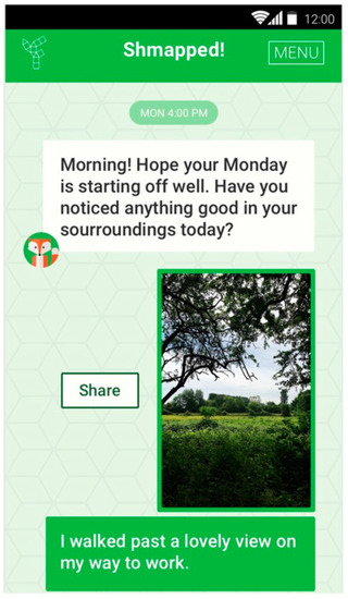 - McEwan, K.; Richardson, M.; Brindley, P.; Sheffield, D.; Tait, C.; Johnson, S.; Sutch, H.; Ferguson, F.J. Shmapped: Development of an app to record and promote the well-being benefits of noticing urban nature. Transl. Behav. Med. 2019, ibz027, 1–11. [Google Scholar] [CrossRef]