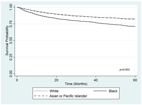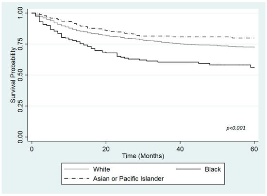 Statistical analysis was performed using STATA (StataCorp LP., College Station, TX, USA) [18]. Categorical variables are presented as proportions. Chi-square tests were used to compare categorical covariates according to the exposure and outcome variables. Kaplan-Meier survival analysis was used to compare overall survival curves. The log-rank test was used to assess differences between survival curves across race/ethnicity. Collinearity was assessed via pairwise correlations. A Pearson’s correlation coefficient absolute value of 0.67 or higher was used for identifying collinearity among a pair of variables. In the study, no collinearity was found among any of the variables included. Patients were follow-up for a maximum length of five years. Unadjusted and adjusted Cox Proportional hazard regression models were used to calculate hazard ratios (HRs) and their corresponding 95% confidence intervals (CIs). Age at diagnosis, gender, marital status at diagnosis, grade at diagnosis, stage at diagnosis, and surgical treatment were included in the adjusted model. Wald test was performed for each variable in order to test the statistical significance of each variable in the model. The adjusted model with an interaction term for race and insurance status was fitted. As at least one of the interaction terms of race*insurance was statistically significant, showing possible effect modification by health insurance, the adjusted model was stratified for each stratum of health insurance. The proportional hazard assumptions were tested graphically. All p values reported are two-tailed, and a p-value of <0.05 was considered as statistically significant.