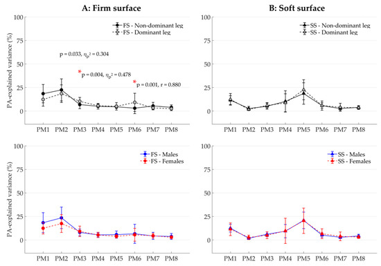 Relative variance spectra of principal accelerations PA_rVARk (mean ± SD) of the first eight principal movements (PM1–8) of balancing on the firm surface (FS; column (A)) and the soft surface (SS; column (B)), representing the leg dominance effect in the first row and the sex effect in the second row. Note: p-Values smaller than 0.05 are shown; however, only results satisfying the Bonferroni–Holm criterion [41] were considered significant and marked with an asterisk *.