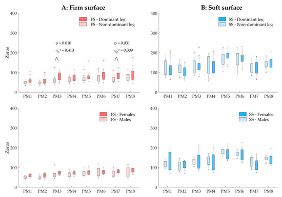 Boxplots of the number of zero-crossings Nk (zeros) of the first eight principal movements (PM1–8) of balancing on the firm surface (FS; column (A)) and the soft surface (SS; column (B)), representing the leg dominance effect in the first row and the sex effect in the second row. Note: p-Values smaller than 0.05 are shown; however, none of the differences satisfied the Bonferroni–Holm criterion [41].