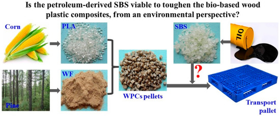 The system boundary of this LCA research is schematically depicted in Figure 2. Energy consumption, water demand, as well as the pollution emissions from the binary PLA-based WPCs and their ternary SBS-modified counterparts will be investigated during their cradle-to-gate life cycles.