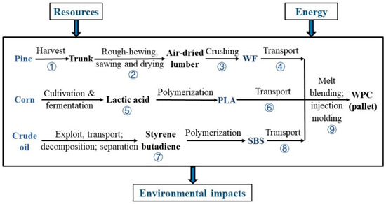 The life cycle inventory method was used to investigate energy and water demand, as well as the pollutant emissions from 1000 kg of the PLA-based WPCs [25]. Then, an input–output model was used to estimate environmental impacts for the PLA-based WPCs during its cradle-to-gate life cycles, as described in Bolin and Xu’s works [19,26].