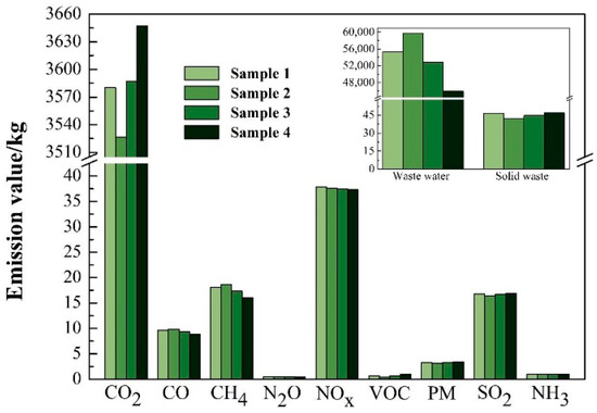 The main pollutants emitted from one ton of the PLA-based WPCs during each step are summarized in an inventory shown in Table 1. All the raw data were excerpted from the previously published peer-reviewed literature. In this cradle-to-gate LCA, some pollutant emissions, from the processes with minimal outputs or hard-to-collect data, were omitted from the dataset and the following impact assessment. The weighting method was used to calculate the total emission of the individual pollutant, according to the different compositions of Sample 1 to 4. The results are shown in Figure 3.