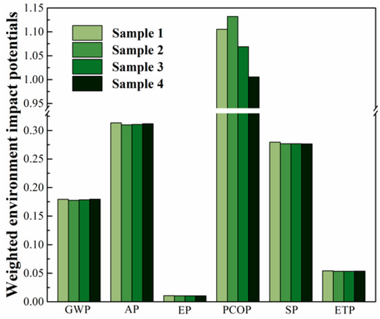 The individual EIL of GWP, AP, EP, PCOP, SP, and ETP from one ton of Sample 1 to 4 was calculated by multiplying the normalized environmental impact potentials with their corresponding weighting coefficients. The results are shown in Figure 4. The PCOP took the largest share among all the six environmental impact categories for all the PLA-based WPCs (Sample 1 to 4), though the total environmental impact potential just added up to about 10, according to Supplementary file Table 3. However, the normalized environmental impact potentials were more than 15.5 for all the PLA-based WPCs, since the PCOP had the smallest POP90 benchmark value (i.e., 0.65 kg C2H4 eq.) in this LCA research. That made the PCOP value of Samples 1, 2, 3, and 4 reach up to 1.1055, 1.1322, 1.0688, and 1.0055, respectively. They are higher than the global average (i.e., 1.0). Meanwhile, the PCOP value for Samples 1 to 4 had the greatest variation among all six environmental impact categories. What’s more, these PCOP values strongly depend on the composition of the PLA-based WPCs. In this context, it is crucial for the manufacturers to optimize the compositions of these PLA-based WPCs in order to reduce their PCOP value due to local environmental impacts, even if the mechanical properties of these composite materials can meet with the application scenarios.
