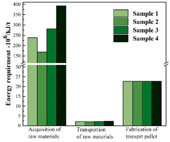 Energy consumption for one ton of the PLA-based WPCs was composed of three parts: acquisition of raw materials (WF, PLA, and SBS), transport of these raw materials, and manufacture of the transport pallets, according to the system boundary of this LCA research. Energy consumption for Samples 1 to 4 during their cradle-to-gate stages was metered, based on their individual compositions. The results are presented in Figure 5.
