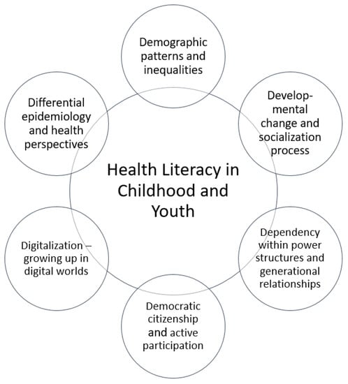 Moreover, Fairbrother, Curtis, and Goyder [1] have drawn attention to children’s health literacy practices in accessing and understanding health information and their reliance on their embodied experiences. From a health promotion perspective, it is, therefore, essential to recognize children and young people as a target group of health literacy research and interventions: childhood and youth are regarded as foundational life phases for healthy human development and for personal health and well-being throughout adulthood e.g., [4]. Because crucial pathways for future health throughout the life course are already evolving and manifesting during childhood and youth [5], children should be supported by meeting their information needs and fostering their active involvement in their own health [6,7]. Accordingly, it is prominently voiced that failing to provide young populations with health literacy and health-promoting capacities would constitute an increased risk for the individual and society in terms of poorer health outcomes and higher costs [8,9,10].