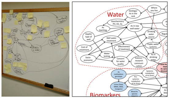 In 2016, a group of approximately 10 experts affiliated or collaborating with the Dartmouth Toxic Metals Superfund Research Program gathered together to create the first expert mental model. The group included epidemiologists, biologists, environmental communication experts, microbiologists and immunologists, and an engineer. We utilized the assembly method of creating the expert model. In this method, experts were gathered together and asked to write down all of the factors that impact a person’s exposure to arsenic. These factors were written on post-it notes that were grouped into categories based on group suggestions, with each category becoming a node (e.g., historic land use). Then, experts worked together to connect nodes using arrows to indicate influence. Figure 2 shows how brainstorming and sticky notes become a mental model of how arsenic risks are generated.