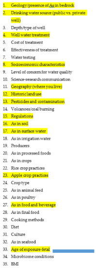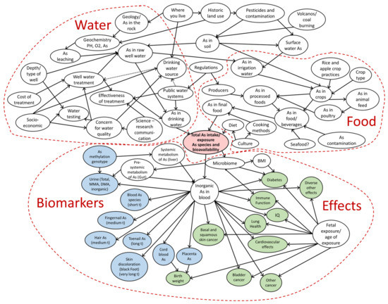 The experts in this process went into depth when asked about the factors that impact arsenic exposure risk. There was a rich discussion about the mechanistic components of exposure with a deep dive into biomarkers, including emerging work on the microbiome. All of the nodes detailed in Figure 3 are included in Table 1.