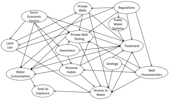 In late 2016, we gathered a group of experts from state health and environmental offices and prompted them with the same question: “What are the factors that affect an individual’s exposure to arsenic.” This time we were specific and added “exposure from drinking water” to the prompt. The discussion from this group of experts focused heavily on the factors that impact well-water testing, treatment, and water consumption (as demonstrated by the number of linkages made to those nodes—7, 10, and 6, respectively). This model, highlighted in Figure 4, is less complicated and easier to read than the initial expert model in Figure 3 as it was focused solely on As exposure via water.