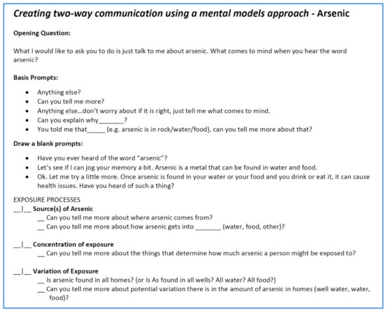 A mental model interview is meant to start very broadly and then narrow into a more specific discussion of the potential risk or issue. Figure 6 is a portion of our interview protocol. We began with the statement “Tell me what comes to mind when you hear the word arsenic”. The interview protocol was then organized into several different sections we called “exposure processes”, “effect processes”, “risk assessment and management”, and “risk comparisons”. The full interview protocol is available in the Supplementary Materials.