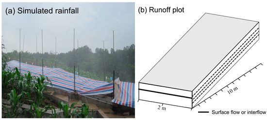 The experiments were conducted at the plot scale using the artificial rainfall simulator (see Figure 2a), and each runoff plot had similar soil and slope characteristics, with a length of 10 m, a width of 2 m and a slope of 10° (see Figure 2b).