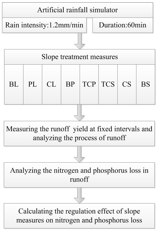 Detailed procedures of artificial rainfall experiments are provided in Figure 3. A downward-oriented nozzle was adopted to simulate rainfall with an uniformity more than 85%. The designed rainfall intensity was 1.2 mm/min, with a duration of 60 min. These parameters were selected by taking reference from Yingwugou watershed, which is located in the middle of the Danjiang River watershed. The actual rainfall intensity was detected during the experiment. During the initial ten minutes of the simulated rainfall, the surface runoff was collected every 2 min. Afterward, the runoff of the experimental plot was collected every 5 min by using plastic buckets for measurement. The runoff flows into the plastic buckets by a collecting tank at the bottom end of the slope. Runoff nutrient indicators, including the total nitrogen (TN), nitrate nitrogen (), ammonium nitrogen (), total phosphorus (TP) and dissolved phosphorus (DP), were determined using an automatic intermittent chemical analyzer (ADA, CleverChem200, Hamburg, Hamburg state, Germany).