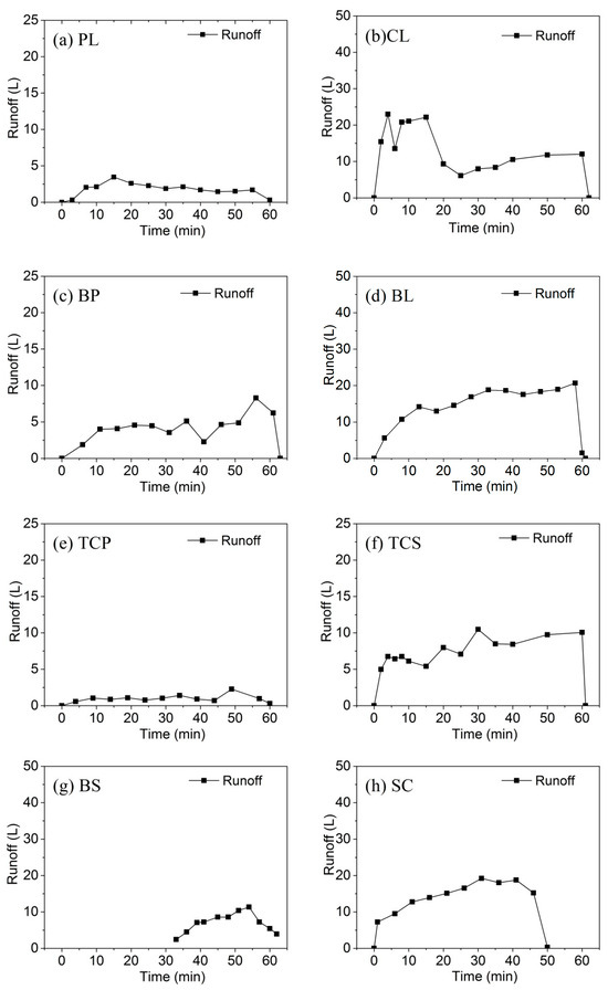 Figure 4 presents different characteristics of the runoff procedure under different crop types. It is shown that during the early stage of a rainfall, the runoff of all the eight crop types increased with an increase in rainfall duration. The increases in the runoff rates of CL(Figure 4b), BL (Figure 4d) and SC (Figure 4f) were significantly higher than those of PL (Figure 4a) and TCP (Figure 4e). During rainfall, the runoff rates of all crops fluctuated but to different extents. After the rainfall was stopped, the runoff rates of all crops decreased rapidly, except for the case of BS. The runoff of other crops was characterized with an increase-steady-decrease trend with the increase in rainfall duration, while BS exhibited a 33-min runoff lag time, which would be due to the change in surface roughness caused by planting BS. After runoff began, BS also exhibited a runoff process that was similar to those of other crops.